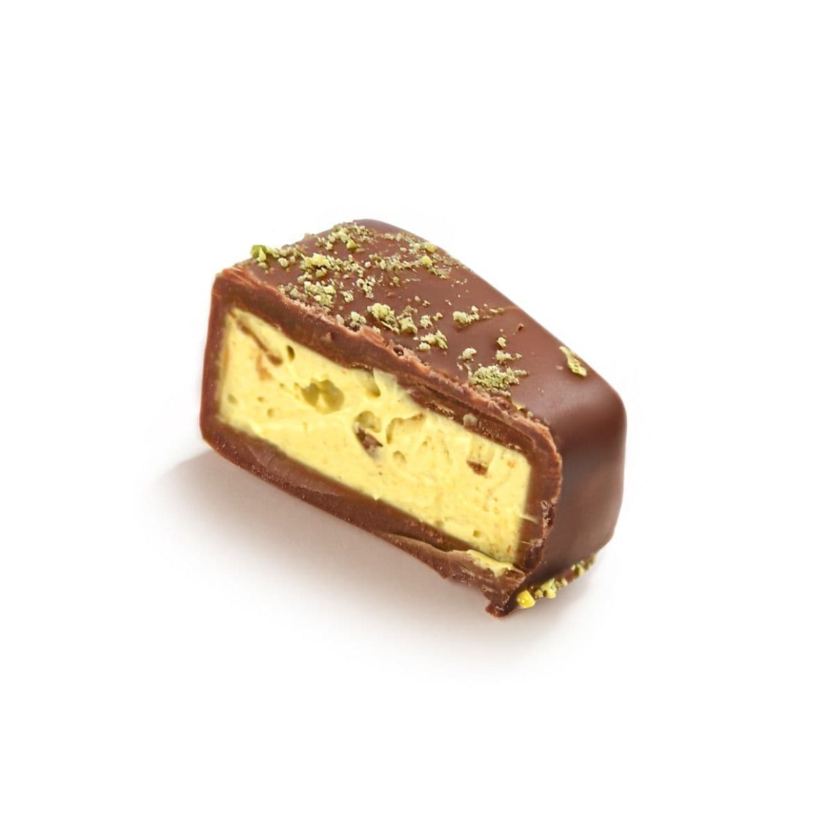 A milk chocolate square with a pistachio cream filling and topped with pistachio crumb.