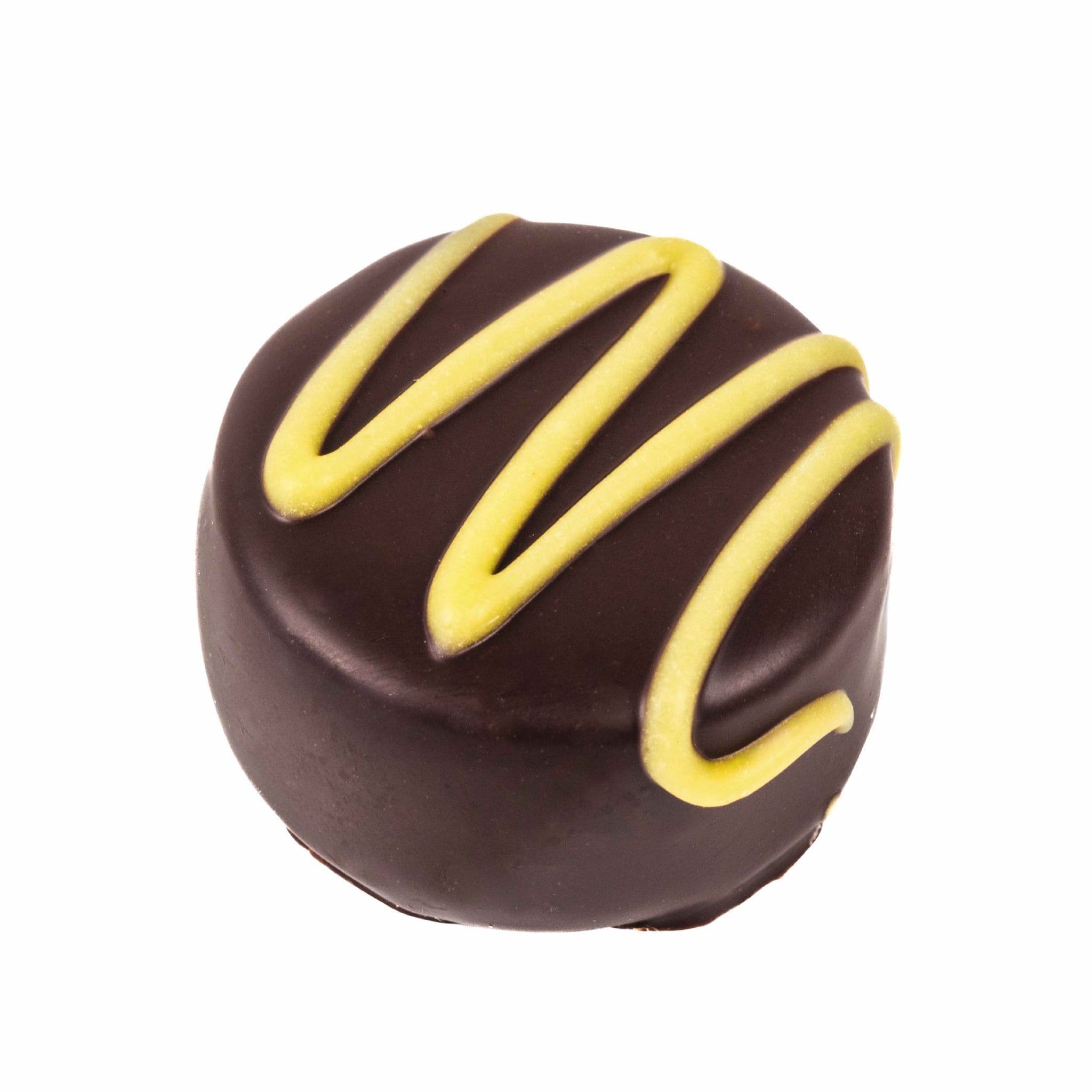 thick dark chocolate with a soft pineapple fondant filling with yellow striped icing decoration on top